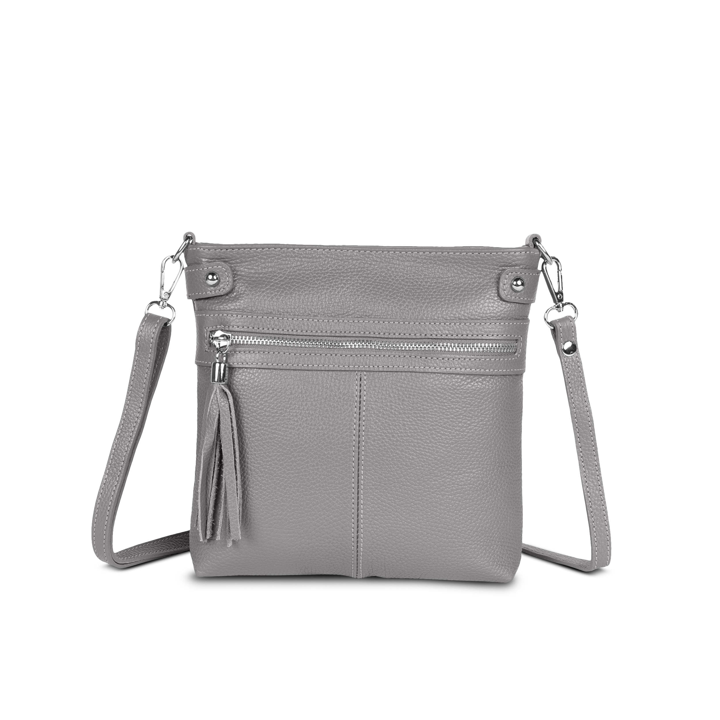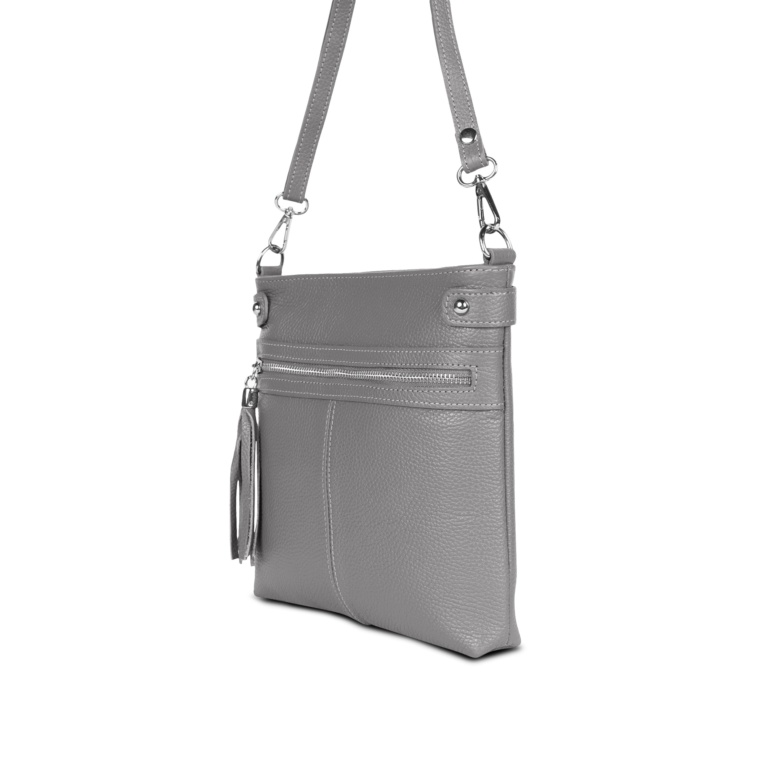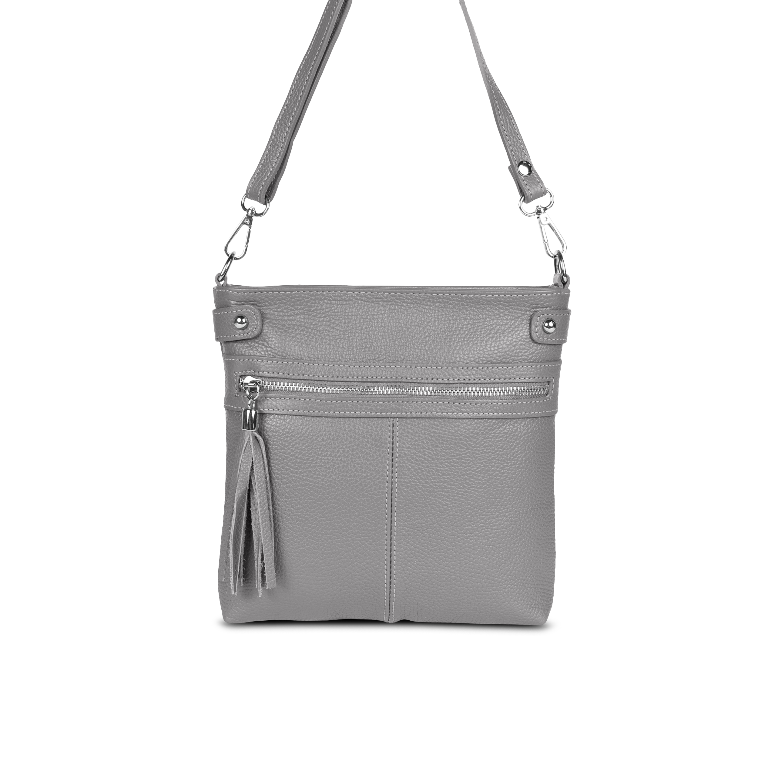 Cas8 Handtasche Romea - Die Handtasche aus Premium-Leder, made in Italy, überzeugt durch ihre Ausstattung und ihre stilvollen Details. Die Umhängetasche verfügt über ein Hauptfach mit Reißverschlussfach, sowie jeweils ein weiteres Reißverschlussfach auf der Vorder- und Rückseite, wobei der vordere Reißverschluss mit einem dekorativen Anhänger versehen ist. Der abnehmbare, längenverstellbare Schultergurt bietet flexible Tragemöglichkeiten, während die Nieten-Applikationen auf der Tasche einen modischen Akzent setzen.