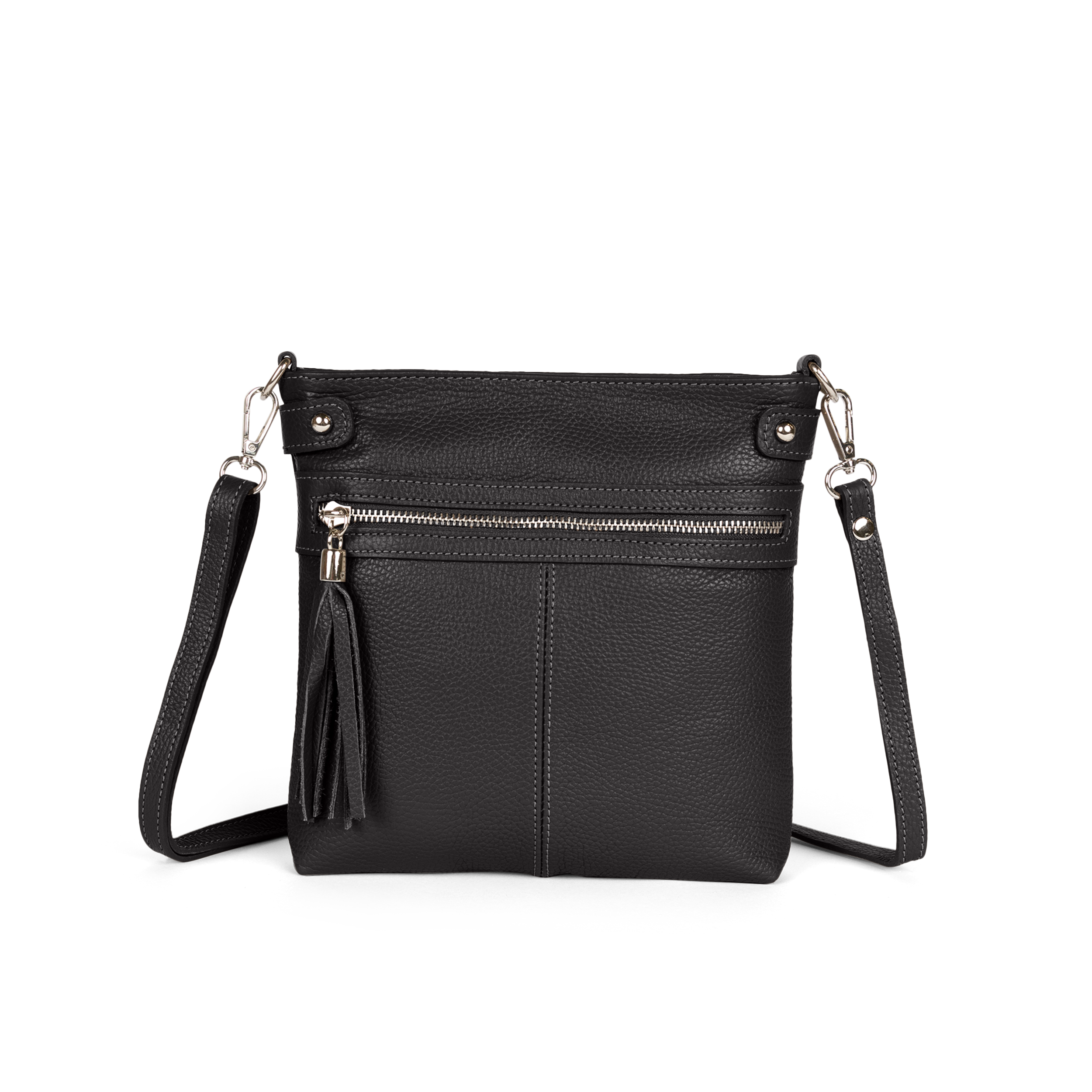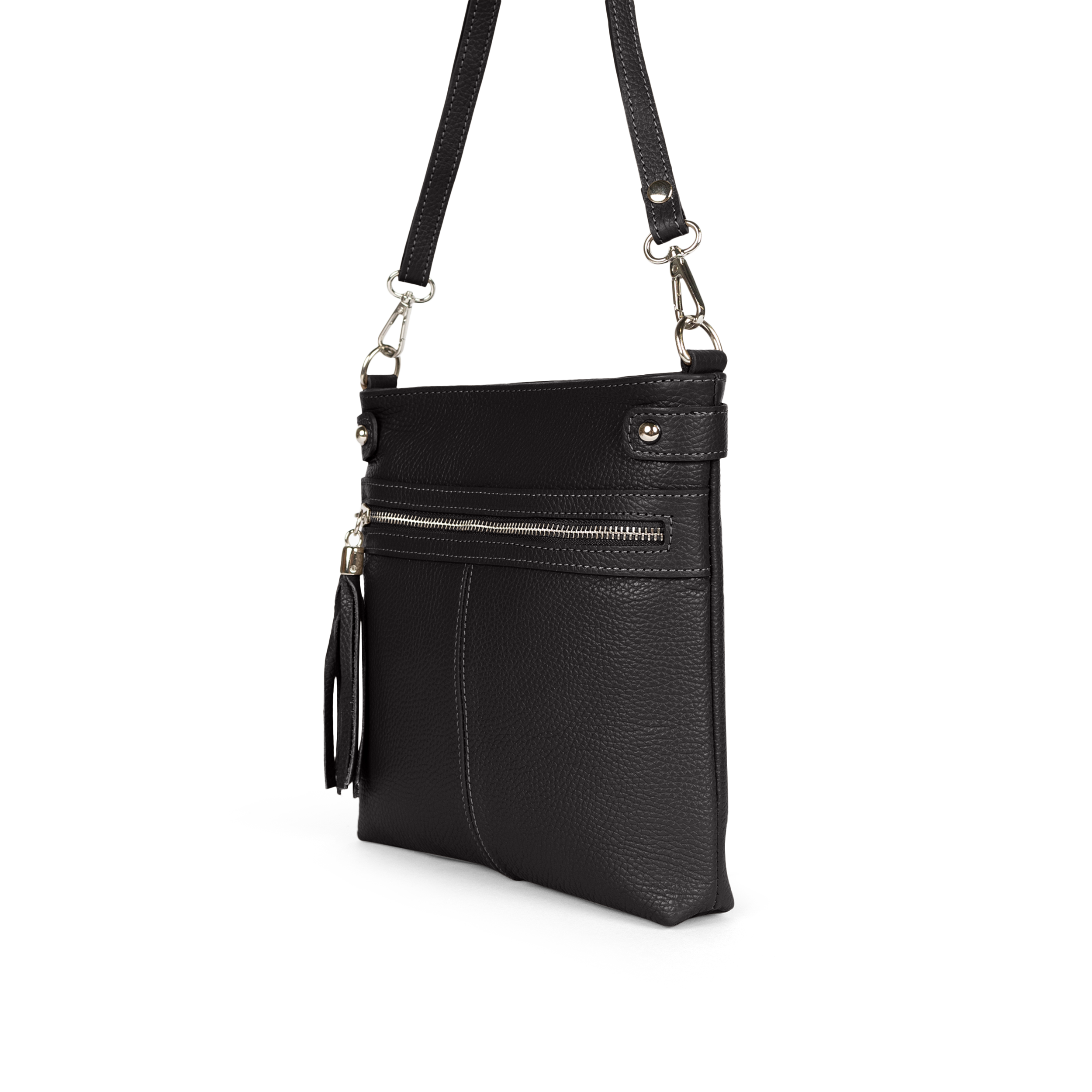 Die Cas8 Handtasche Romea aus Premium-Leder, made in Italy, kombiniert funktionale Ausstattung mit stilvollen Details wie mehreren Reißverschlussfächern, einem dekorativen Anhänger und Nieten-Applikationen.