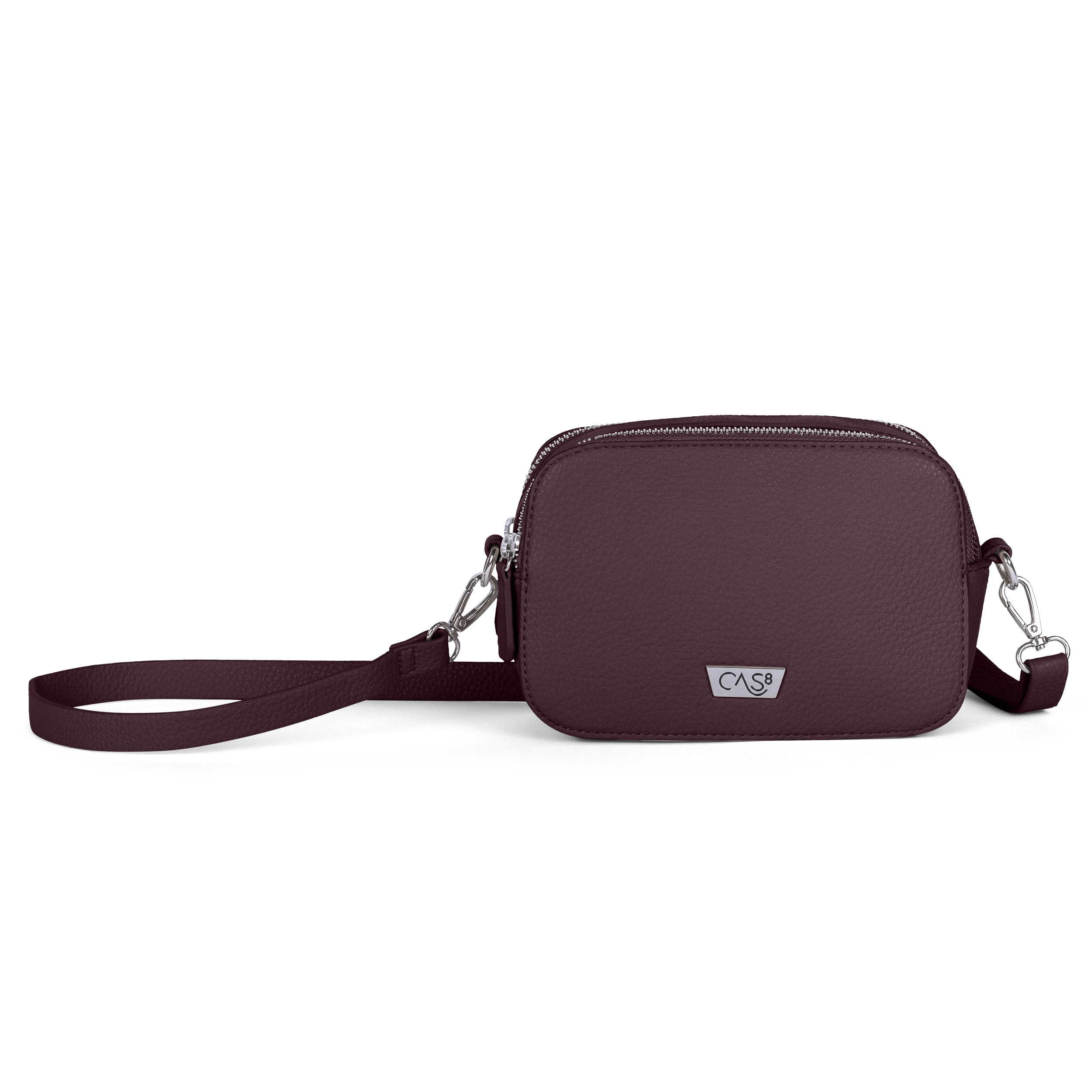 Cas8 Umhängetasche JULIA 34000 – Kompakte, stilvolle Tasche mit zwei Reißverschluss-Hauptfächern, 1 Innenfach, 3 Steckfächern und robustem Design. Der abnehmbare, längenverstellbare Schultergurt (bis 150 cm) sorgt für vielseitigen Tragekomfort. Maße: 20 x 12,5 x 7 cm, Gewicht: 260 g. Material: Strapazierfähiges PU.