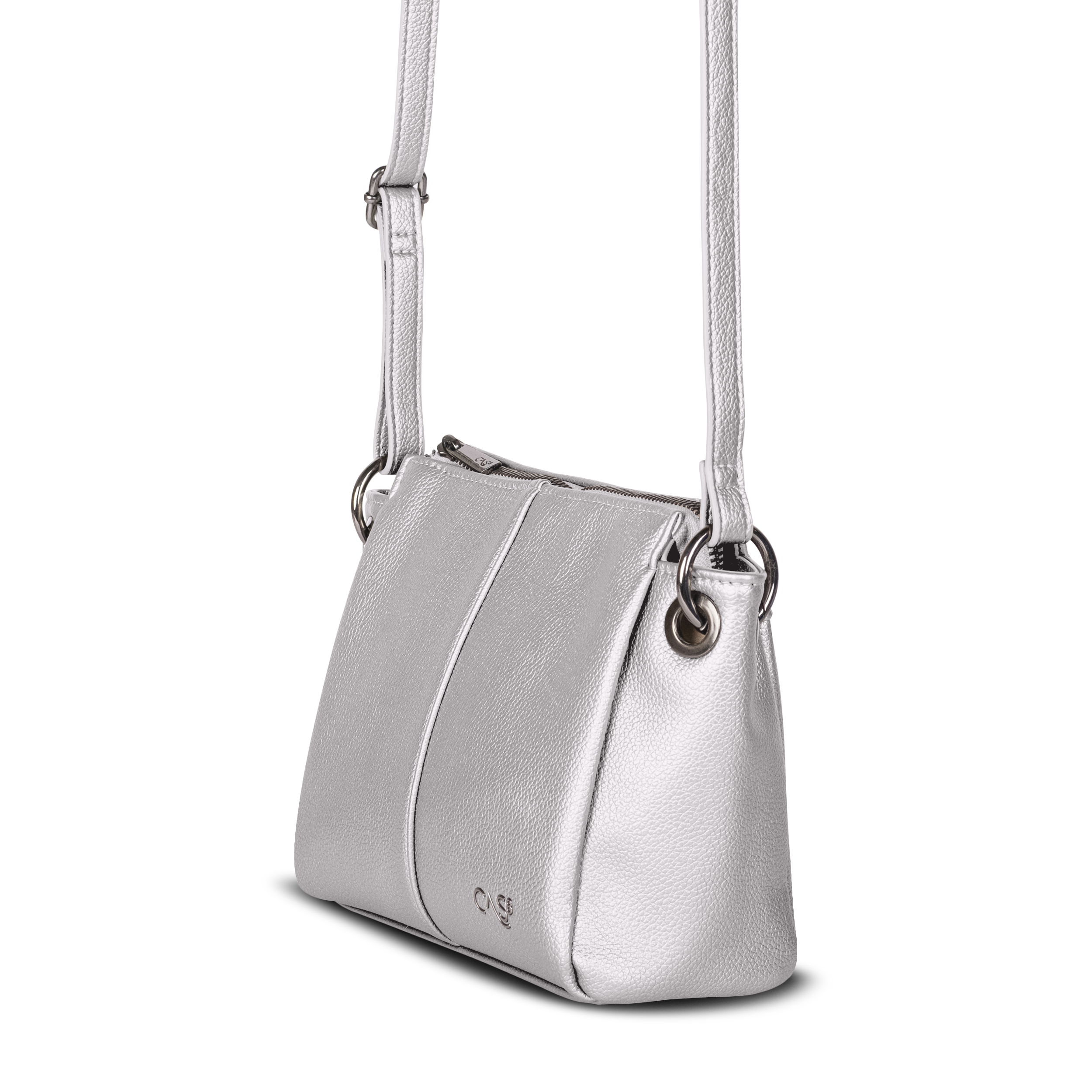 Die kleine, elegante Cas8 Umhängetasche ELLA 34505 in Metallic-Optik kombiniert stilvolle Vielseitigkeit mit praktischen Details wie zwei Reißverschlussfächern und einem abnehmbaren Schultergurt – perfekt für glamouröse Auftritte mit leichtem Gepäck.