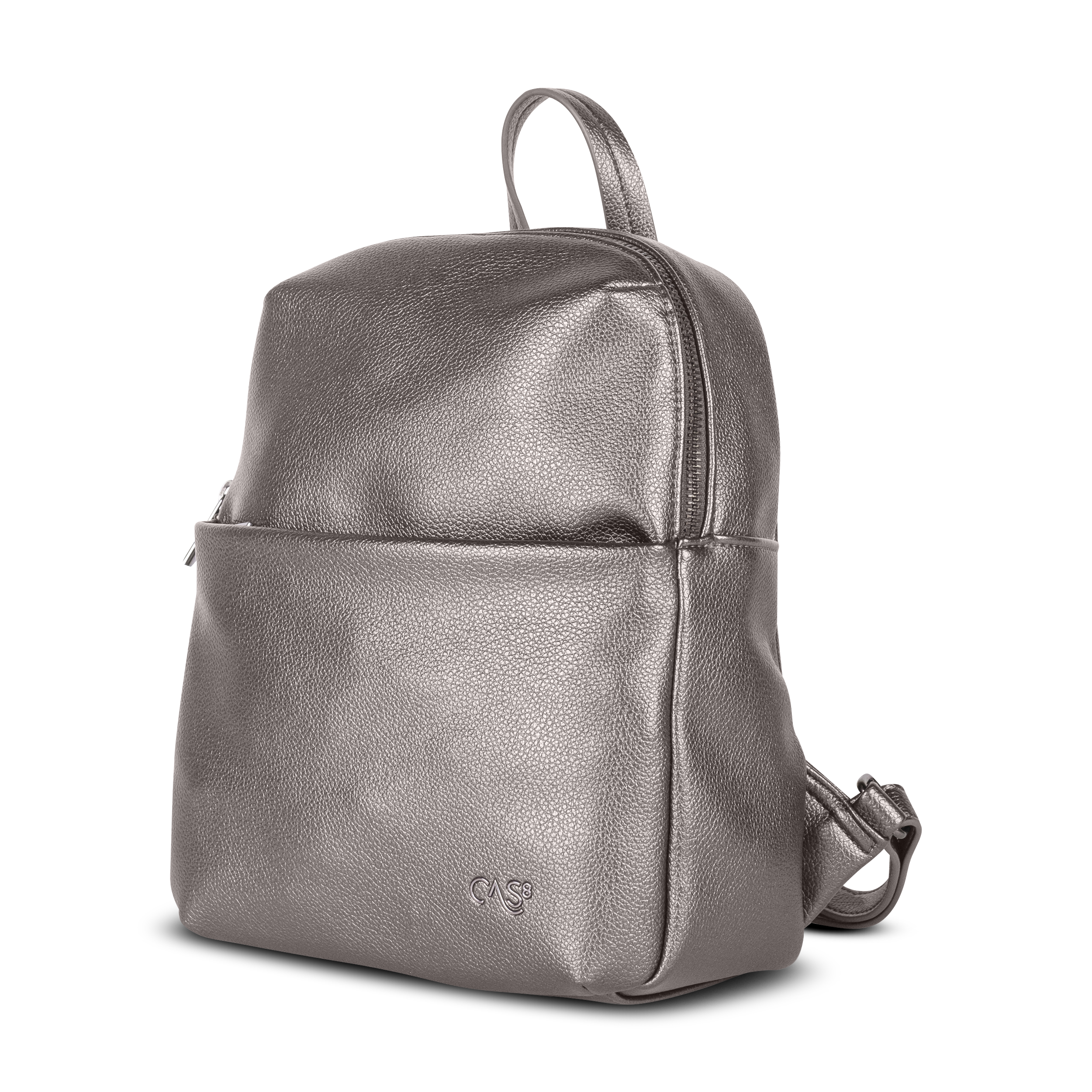 Der kompakte Cas8 City-Rucksack ELLA 30750 (23 x 28,5 x 11 cm) kombiniert eleganten Metallic-Chic mit cleverer Aufteilung – inklusive Front- und Rückfach mit Reißverschluss sowie praktischen Innenfächern für stilvollen Komfort im urbanen Alltag.