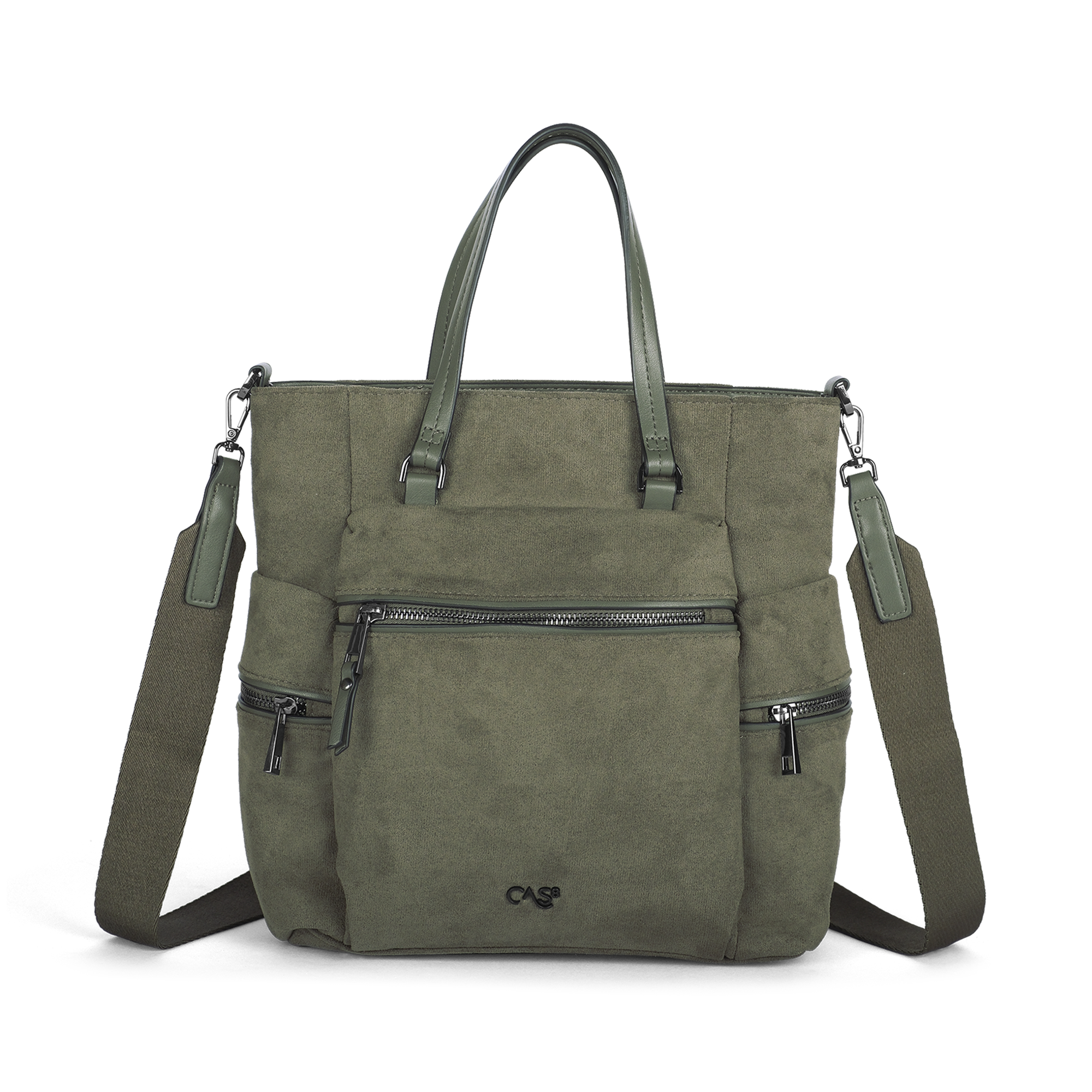 Cas8 Handtasche Rike 33710 - Die Tasche mit Rucksackfunktion aus der Rike-Serie von Cas8 überzeugt als wandelbarer Alltagsbegleiter mit durchdachter Funktionalität und einem modernen Look. Gefertigt aus weichem, veganem Suede, besticht die mittelgroße Umhängetasche (31 x 27 x 11 cm) durch ihre samtige Haptik und die hochwertige Verarbeitung. Zwei stabile Tragehenkel, ein breiter Stoffgurt für das Tragen als Crossbodybag sowie ein zusätzlicher Gurt für die Rucksackfunktion machen die Tasche flexibel tragbar – ob elegant in der Hand, lässig über der Schulter oder praktisch als Rucksack. Das Hauptfach der 2-in-1-Tasche lässt sich mit einem Reißverschluss sicher verschließen. Im Inneren bietet ein Reißverschlussfach Platz für Wertsachen. Außen sorgen zwei seitliche Fächer mit Reißverschluss sowie eine Vordertasche für zusätzlichen Stauraum und schnellen Zugriff auf Essentials wie Schlüssel, Handy oder Lippenpflege. Mit ihren vielen Funktionen ist die Handtasche ein echter Allrounder für das Büro, über den Stadtbummel bis hin zum Wochenendausflug.