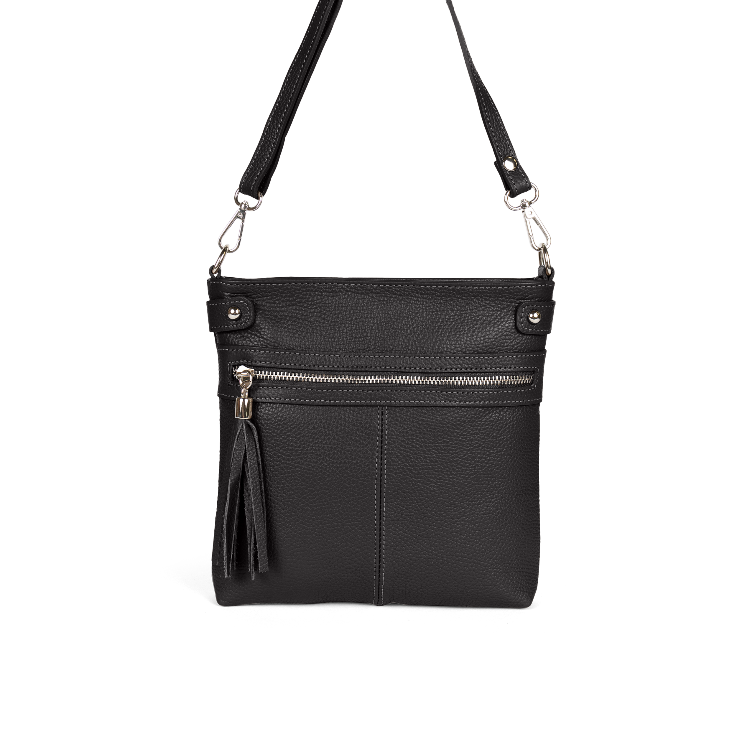 Die Cas8 Handtasche Romea aus Premium-Leder, made in Italy, kombiniert funktionale Ausstattung mit stilvollen Details wie mehreren Reißverschlussfächern, einem dekorativen Anhänger und Nieten-Applikationen.