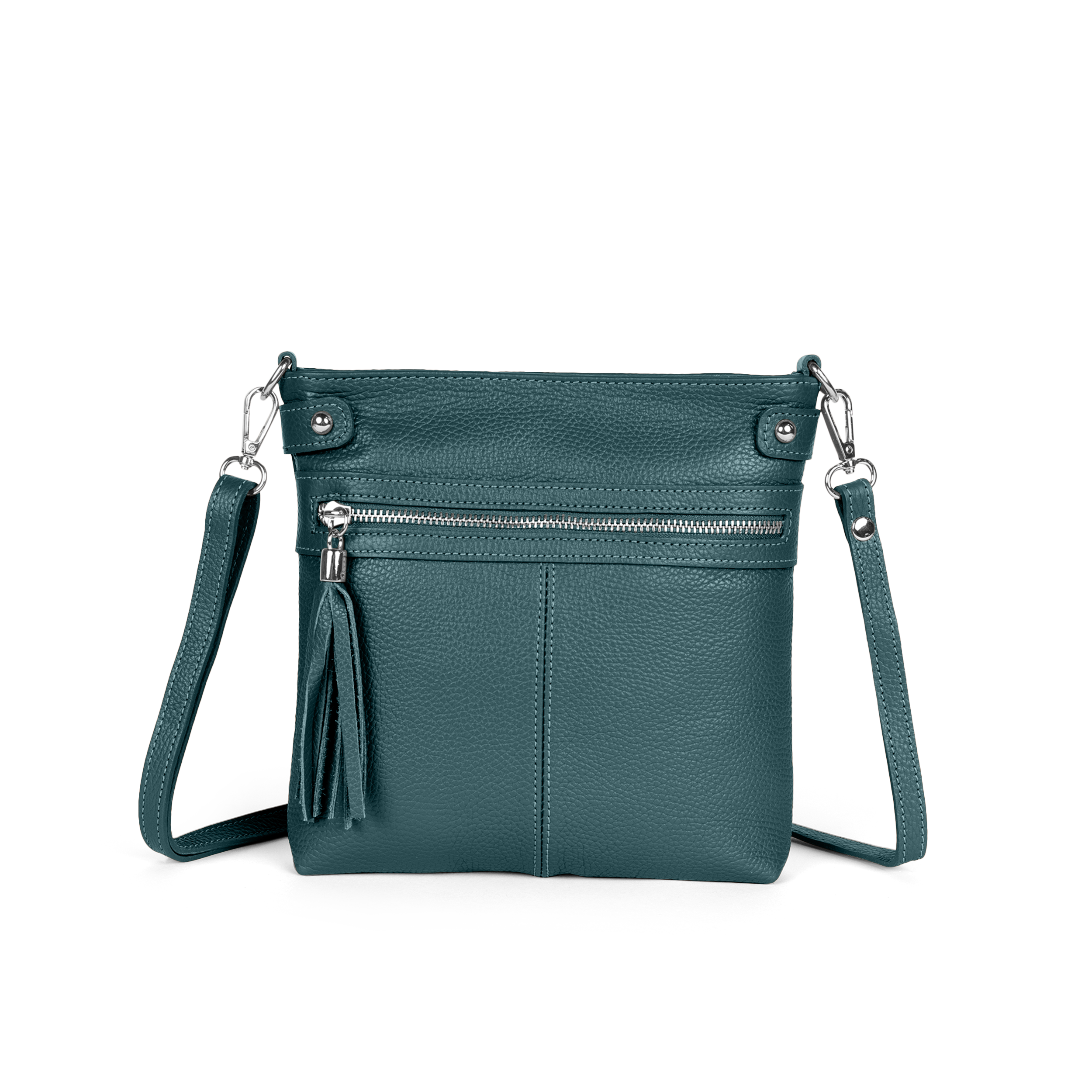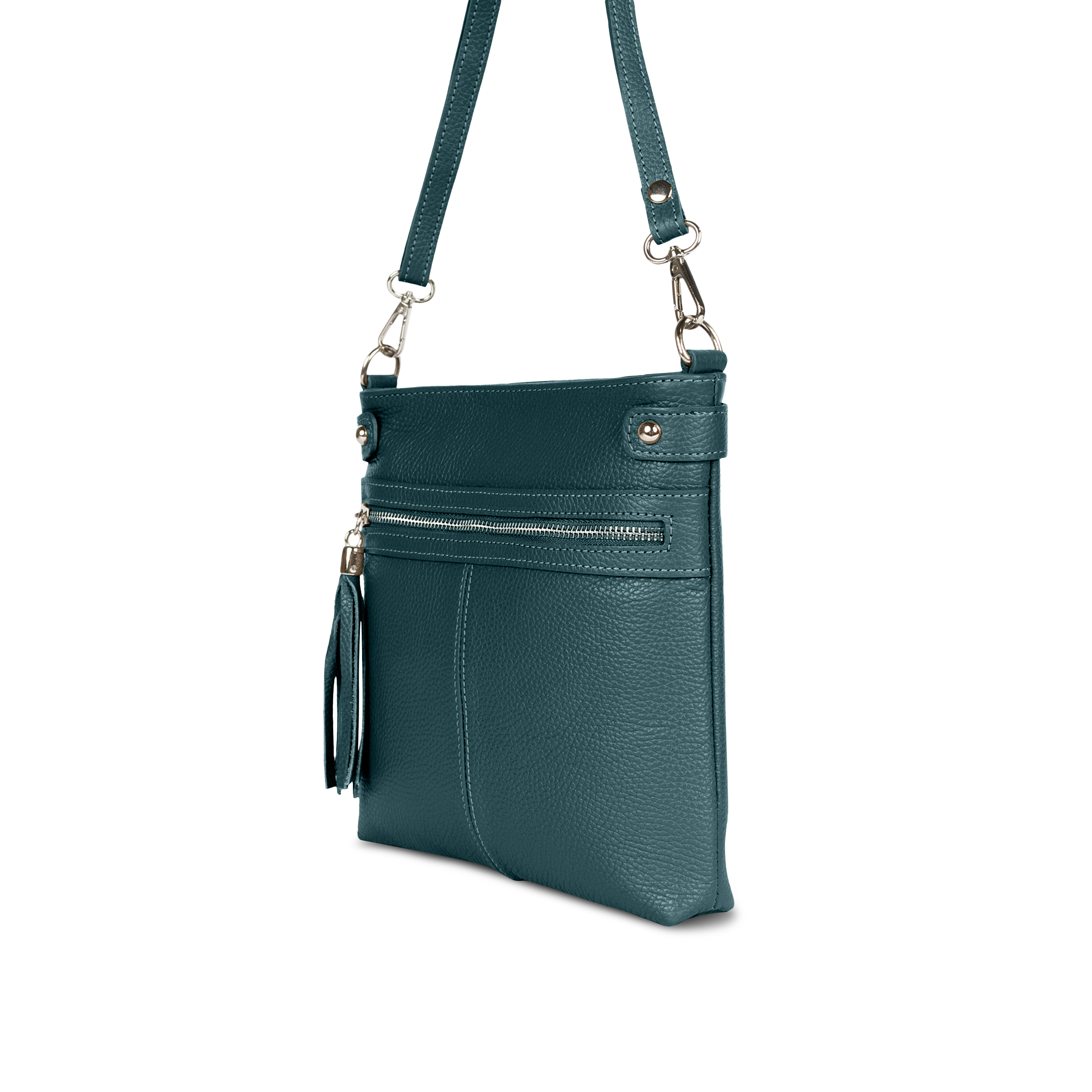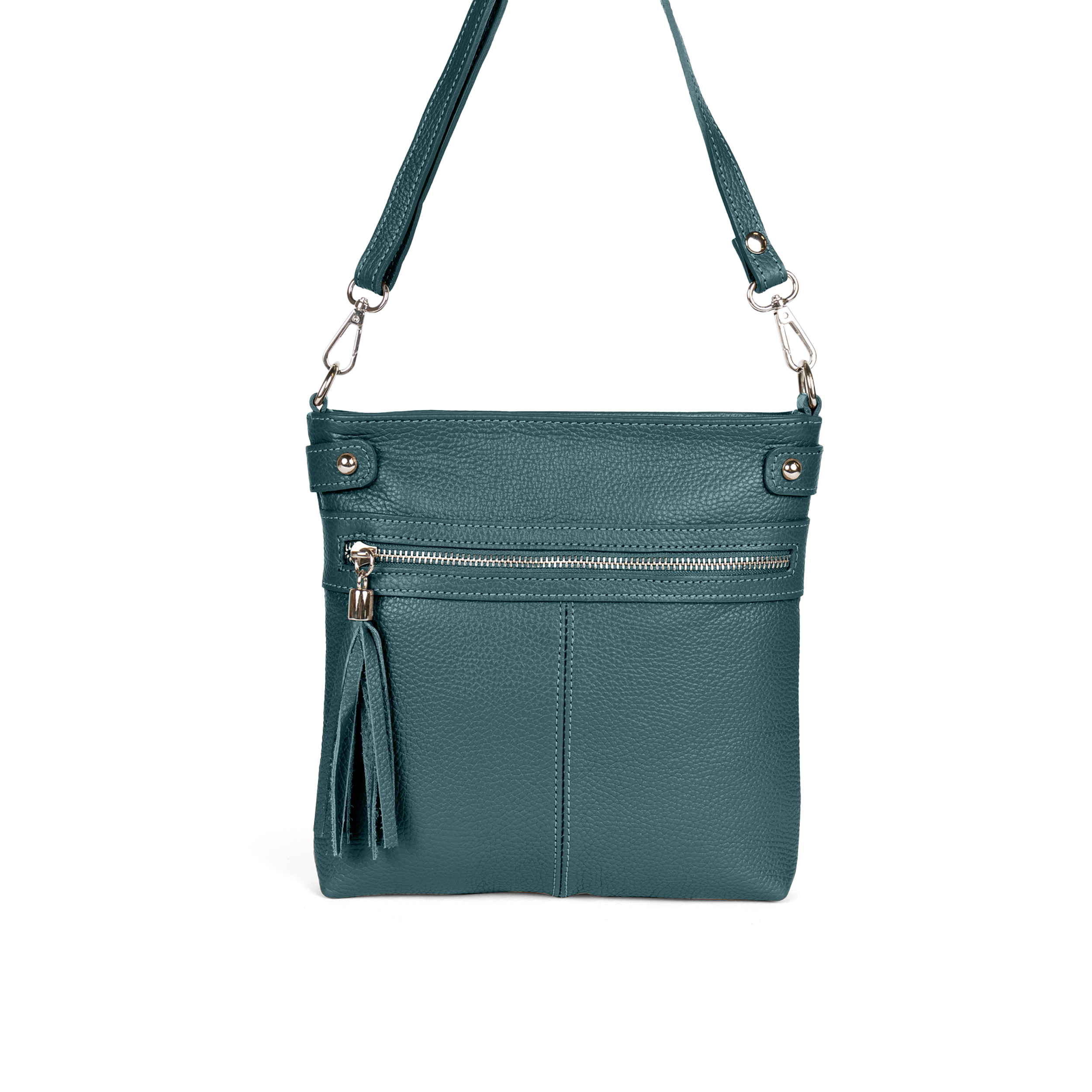 Cas8 Handtasche Romea - Die Handtasche aus Premium-Leder, made in Italy, überzeugt durch ihre Ausstattung und ihre stilvollen Details. Die Umhängetasche verfügt über ein Hauptfach mit Reißverschlussfach, sowie jeweils ein weiteres Reißverschlussfach auf der Vorder- und Rückseite, wobei der vordere Reißverschluss mit einem dekorativen Anhänger versehen ist. Der abnehmbare, längenverstellbare Schultergurt bietet flexible Tragemöglichkeiten, während die Nieten-Applikationen auf der Tasche einen modischen Akzent setzen.