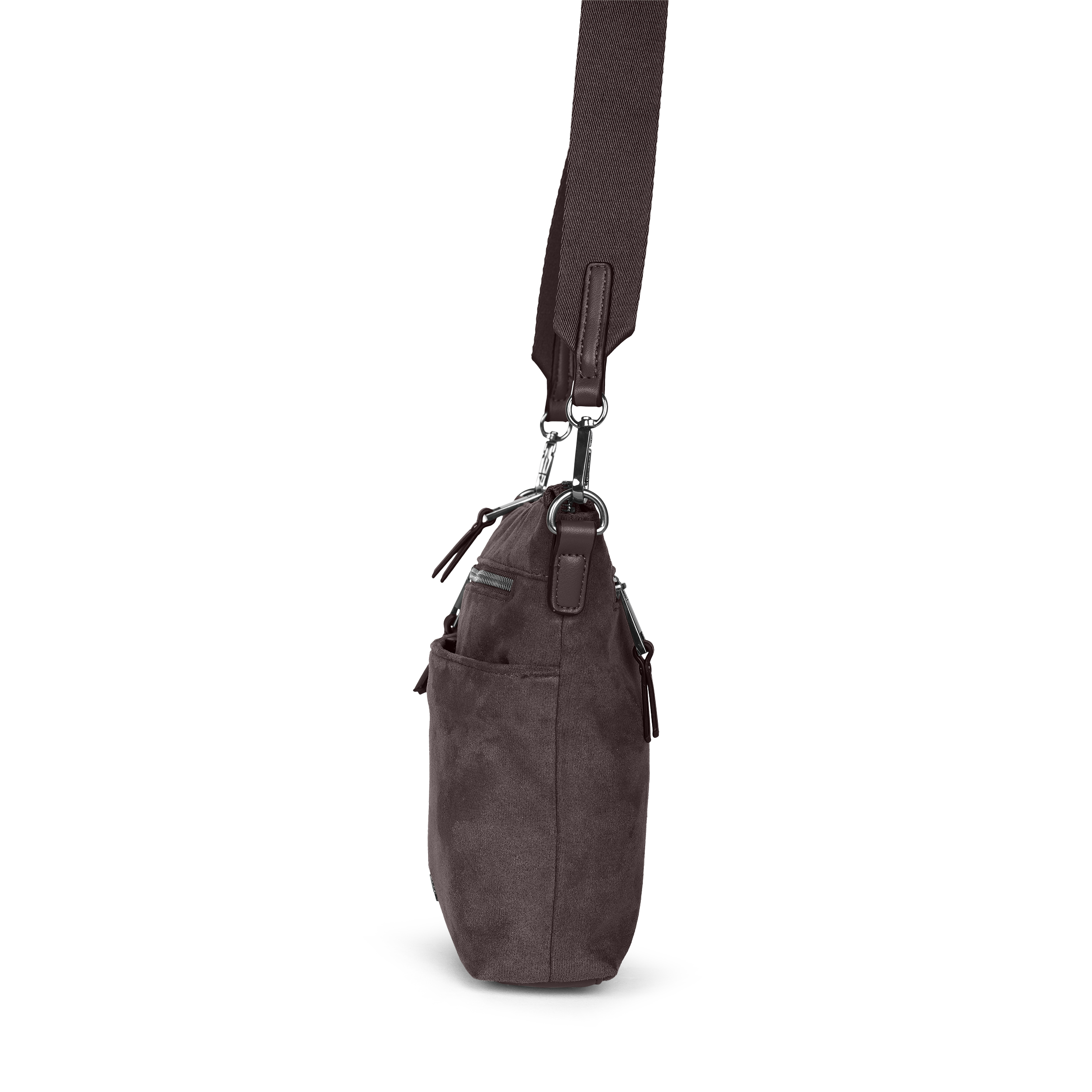 Kleine Umhängetasche aus samtigem, veganem Suede. Zurückhaltend im Design, weich in der Optik – perfekt für Alltag und Freizeit.