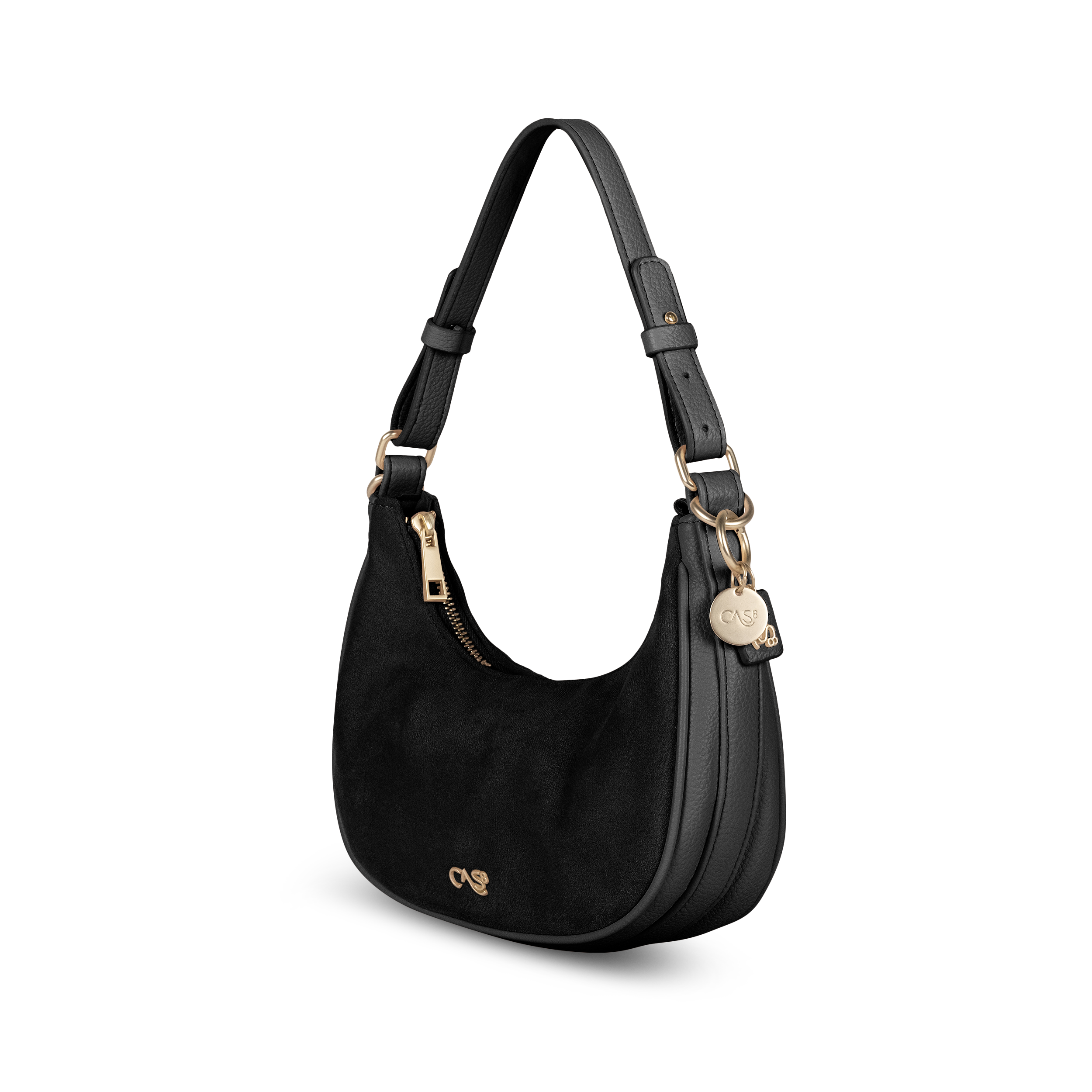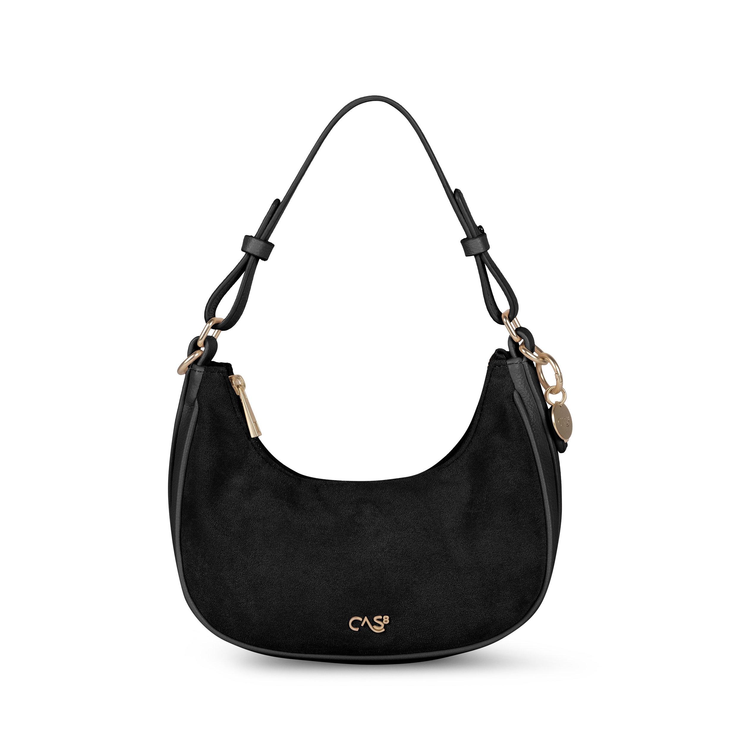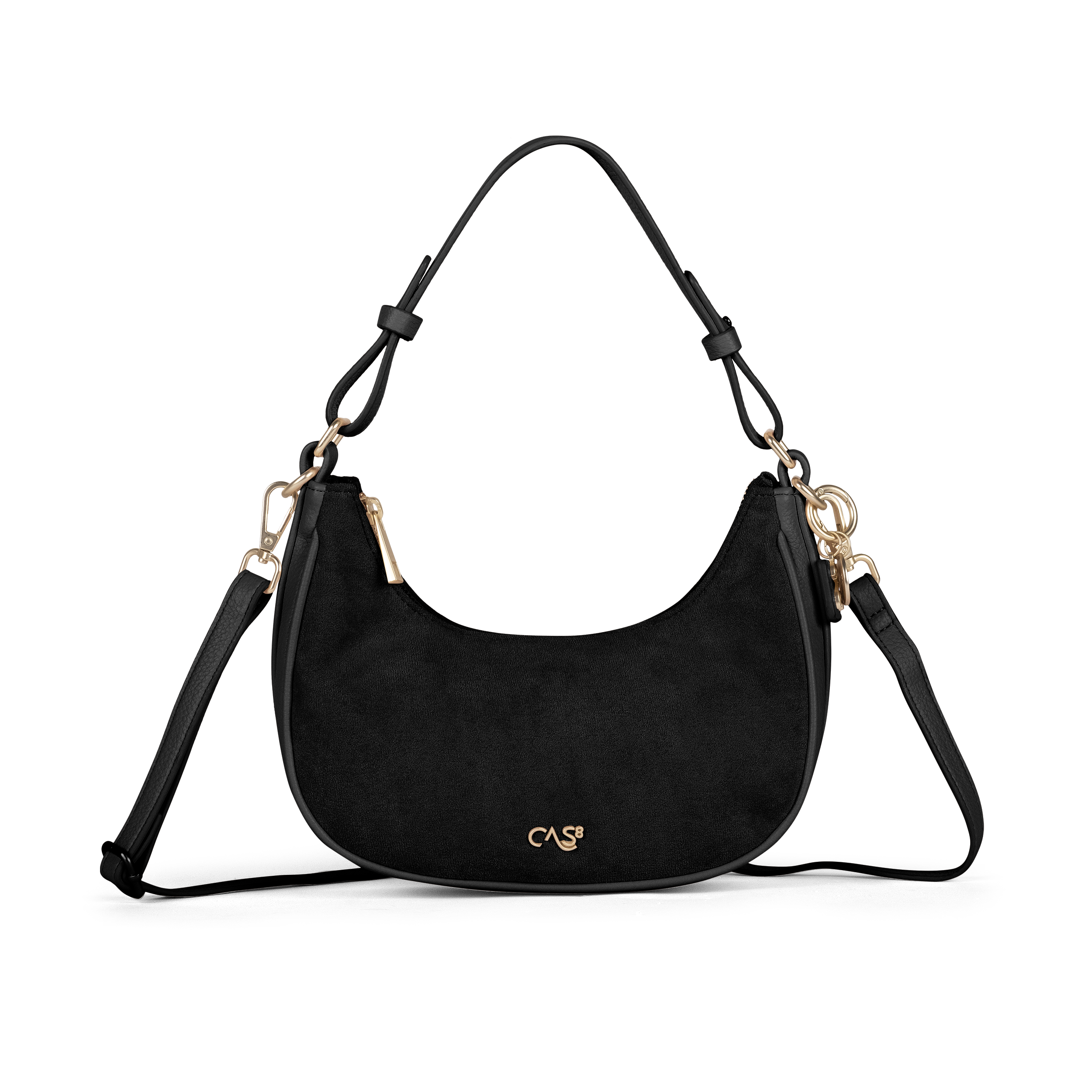 Die Cas8 Handtasche Rike 35365 überzeugt mit kleiner, eleganter Halbmondform, veganem Suede, praktischem Reißverschlussfach und abnehmbarem Schultergurt – vielseitig als Crossbody-, Schulter- oder Handtasche tragbar.